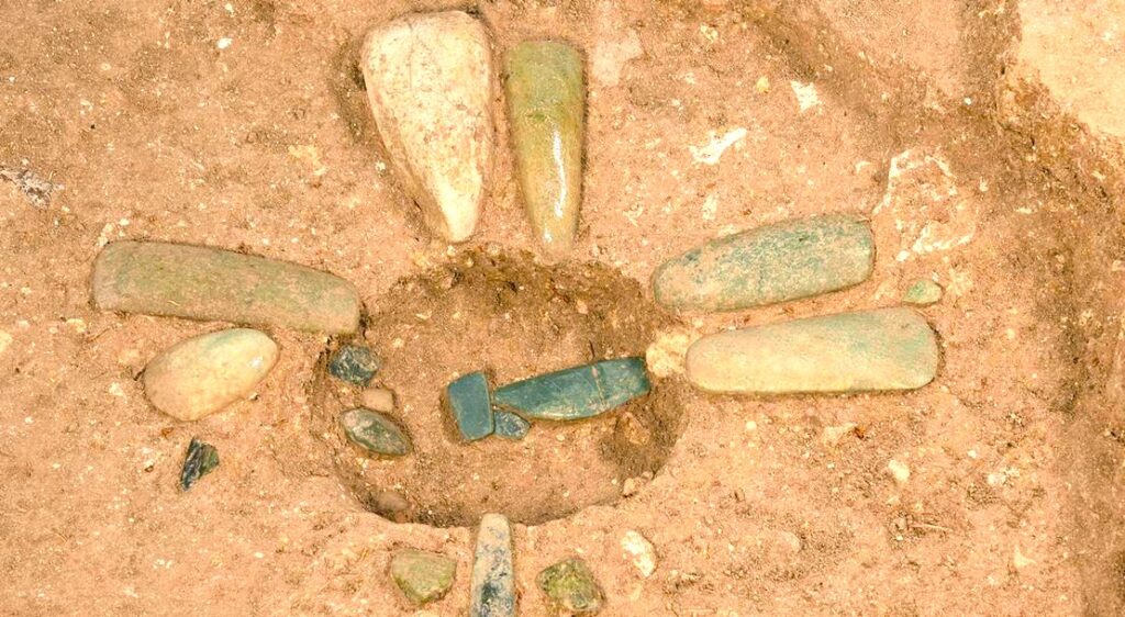 Entre los hallazgos destacan hachas ceremoniales y adornos de jade tallados con figuras de animales y seres humanos, incluyendo lo que los investigadores interpretan como una mujer dando a luz, símbolo de creación y renacimiento.