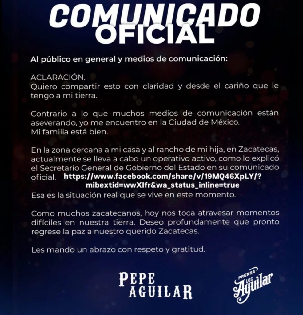 Por su parte, Pepe Aguilar emitió un comunicado para desmentir las versiones que lo colocaban como víctima de un atentado. El artista aclaró que se encontraba en la Ciudad de México y que su familia estaba a salvo.