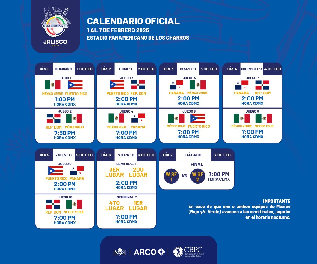 La cuenta regresiva comenzó. La Confederación de Béisbol Profesional del Caribe (CBPC), en coordinación con el Comité Organizador Jalisco 2026, presentó de manera oficial el calendario de juegos de la 68.ª Serie del Caribe, torneo que se disputará del 1 al 7 de febrero de 2026 en Guadalajara, Jalisco.