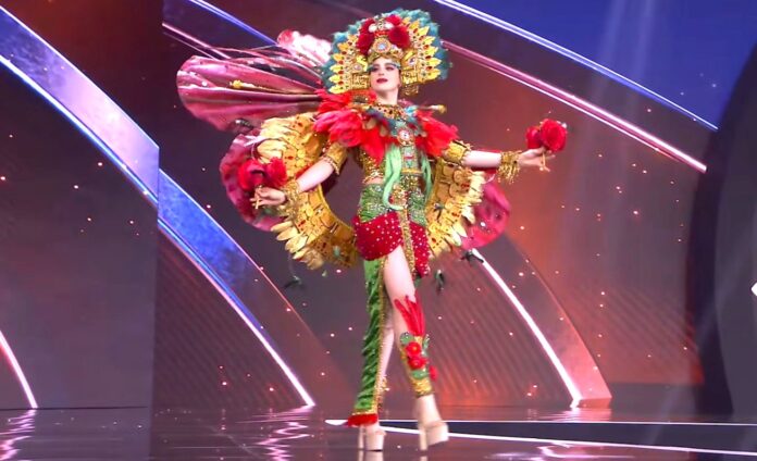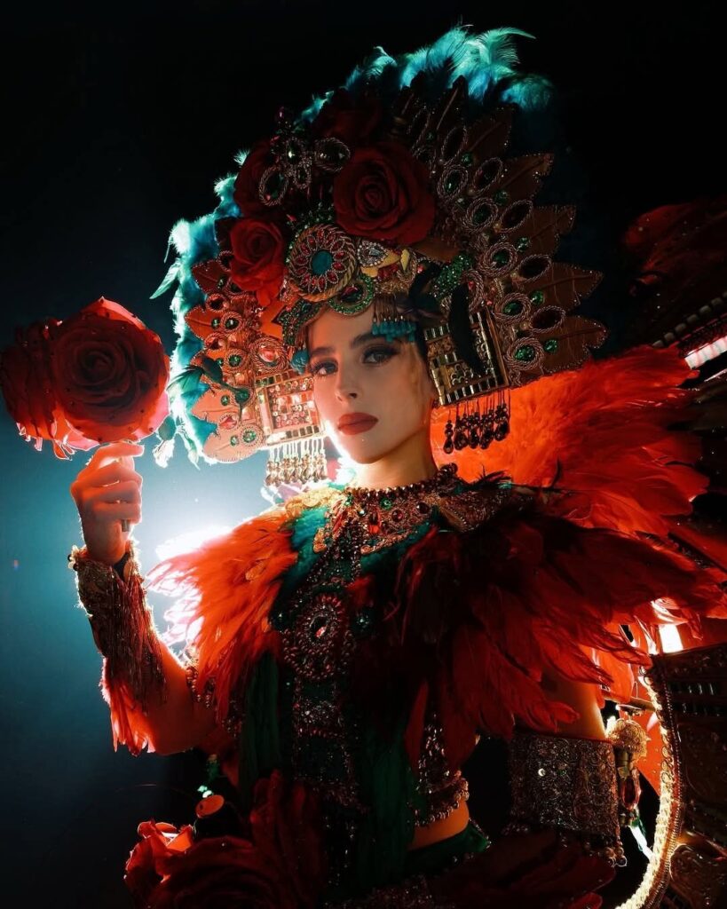 El diseño, obra del mexicano Fernando Ortiz, destacó por su explosiva combinación de dorados, verdes y rojos, además de un elaborado penacho que, aunque visualmente pesado, representó el mayor reto físico para la modelo.