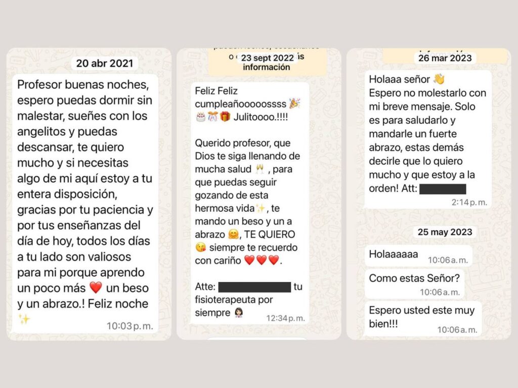 En otros mensajes se hace referencia a sesiones de ejercicios, cuidados posturales y salud, así como felicitaciones y muestras de afecto enviadas incluso después de haber terminado la relación laboral.