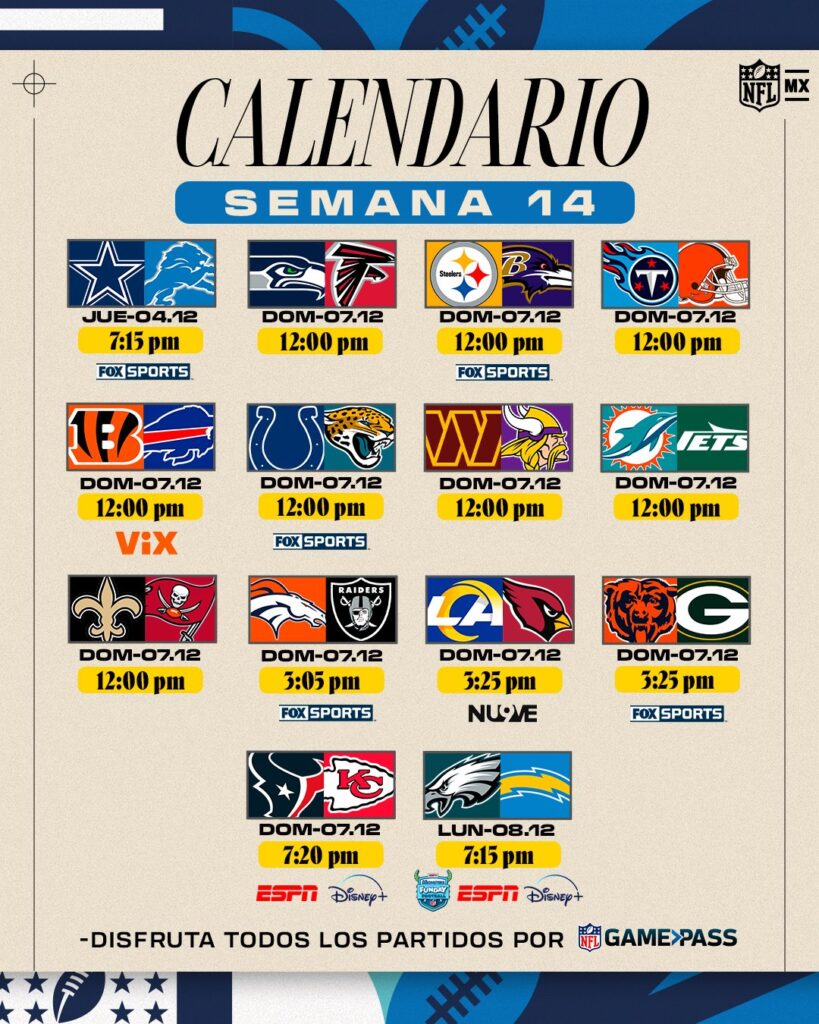 La Semana 14 de la NFL llega cargada de duelos divisionales, clásicos históricos y equipos desesperados por mantenerse con vida en la carrera a los playoffs. Dos rivalidades icónicas encabezan el calendario: Steelers vs. Ravens y Bears vs. Packers, ambos con implicaciones directas en la postemporada.