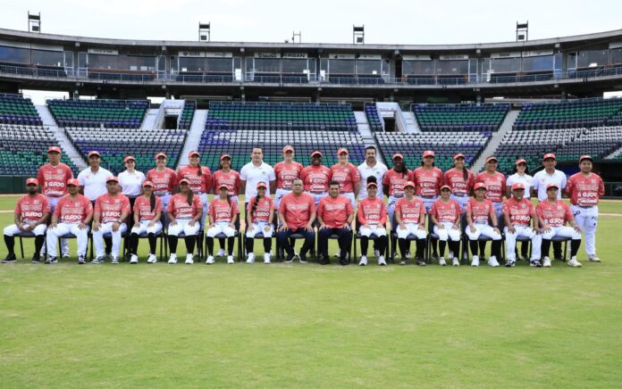 • El equipo de softbol femenil se tomó la fotografía oficial, junto al Gobernador y el presidente del Club Olmecas de Tabasco, Daniel Gómez Arellano