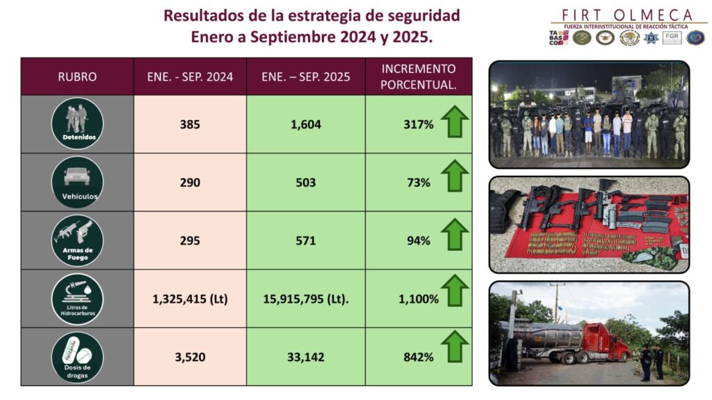 • De enero a septiembre 2025, la estrategia de seguridad refleja aumento de 1,100% en combate de robo de hidrocarburos; 842% en decomiso de dosis de drogas, 94% en armas de fuego, y 73% de unidades vehiculares aseguradas