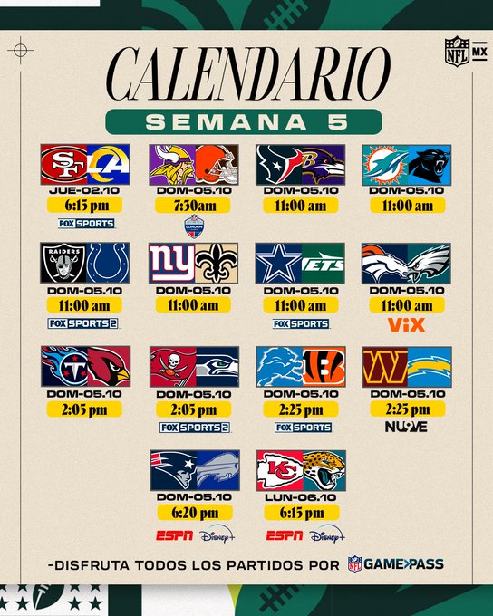 Lo más destacado de la Semana 5 incluye el partido 49ers-Rams en el Jueves por la Noche, otro inicio temprano el domingo con el partido de Minnesota vs. Cleveland que se jugará en el Tottenham Hotspur Stadium en Londres, una ventana de juego cargada al final de la tarde los Bucs contra los Seahawks y los Commanders contra Chargers son fascinantes y, finalmente, el partido Chiefs vs. Jaguars en el Lunes por la Noche. Pásale que tenemos los pronósticos y Sin Tanto Show.