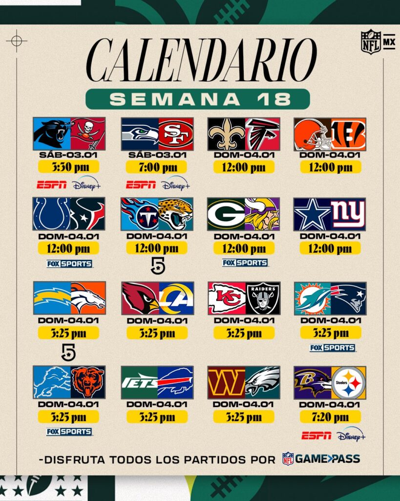 Aun así, hay partidos imperdibles: se definen campeones divisionales, ventajas de localía y los últimos boletos a los playoffs tanto en la AFC como en la NFC. Broncos y 49ers buscan asegurar ventaja de local, mientras que Ravens y Steelers protagonizan un duelo directo por el título de la AFC Norte.