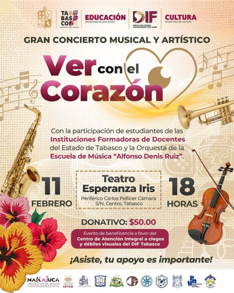 En Tabasco, la Secretaría de Educación anunció la realización del Gran Concierto Musical y Artístico con Causa “Ver con el Corazón”, un evento que busca unir talento, arte y solidaridad en beneficio del Centro de Atención Integral a Ciegos y Débiles Visuales del DIF Tabasco.